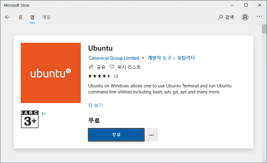 Microsoft Store에서 Ubuntu 선택할 때 명확한 Ubuntu 버전이 기입되어 있지 않아 어떤 버전이 설치될지 몰랐는데, 18.04 가 설치되었다. 만약 설치를 원하는 Ubuntu 버전이 있다면 Microsoft Store 에서 검색시 버전명까지 입력하면 아래와 같이 확인이 가능하다.