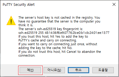 2) 처음 접속하는 SSH Server 의 경우 아래와 같이 PuTTY Security Alert 가 발생하는데 "예(Y)" 버튼을 선택한다.