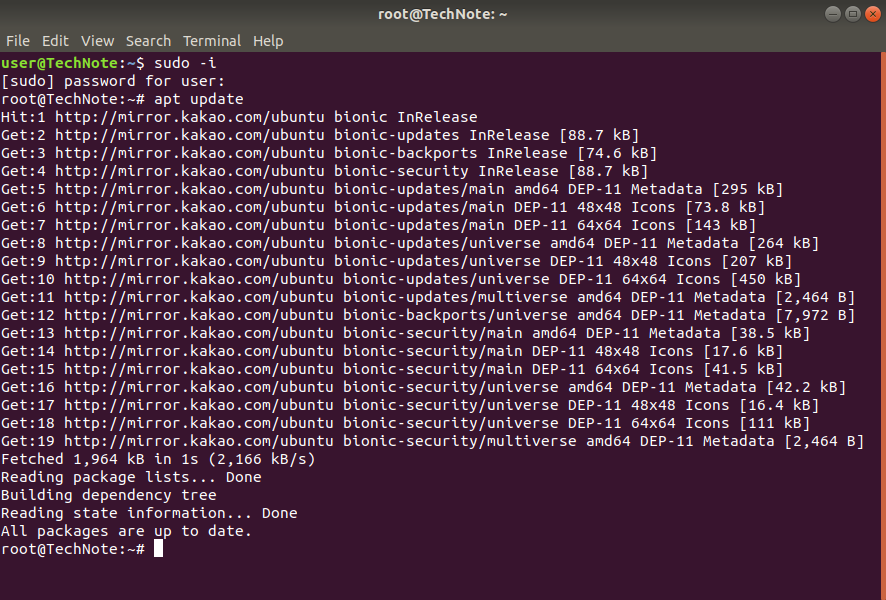 5) apt update 를 해보면 선택한 저장소의 package list 가 받아지는 것을 확인할 수 있다.