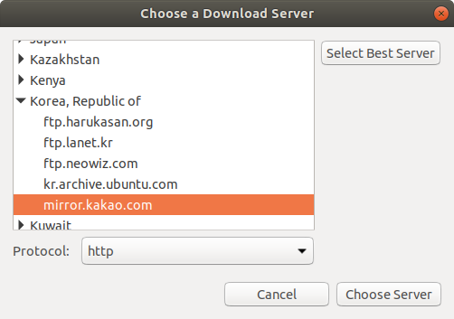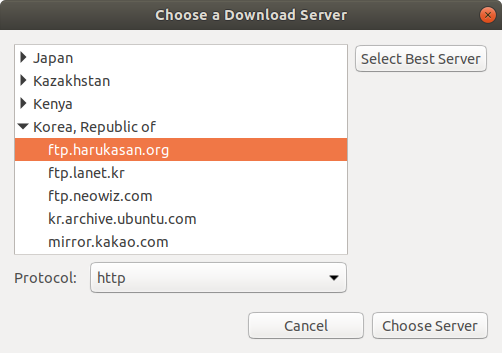 4) 오른쪽의 "Select Best Server"를 선택하면 현재 상황에서 연결 상태가 가장 좋은 저장소가 자동 선택된다.