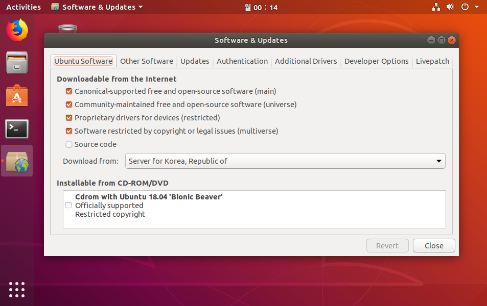 하지만 저장소 주소를 항시 외우고 있는 경우가 없기 때문에 이때는 Ubuntu의 "Software & Updates" 에서 제공해 주는 저장소 (repository) 변경 기능을 사용하면 유용하다.