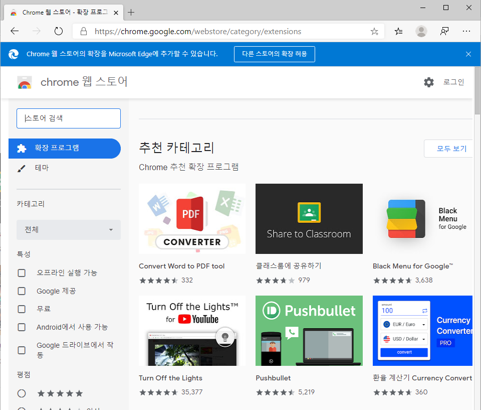 Microsoft Edge Addons 및 chrome 웹 스토어의 사용