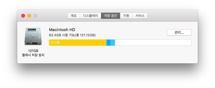 왼쪽 상단 사과 모양 아이콘 > 이 MAC에 관하여 > 저장공간