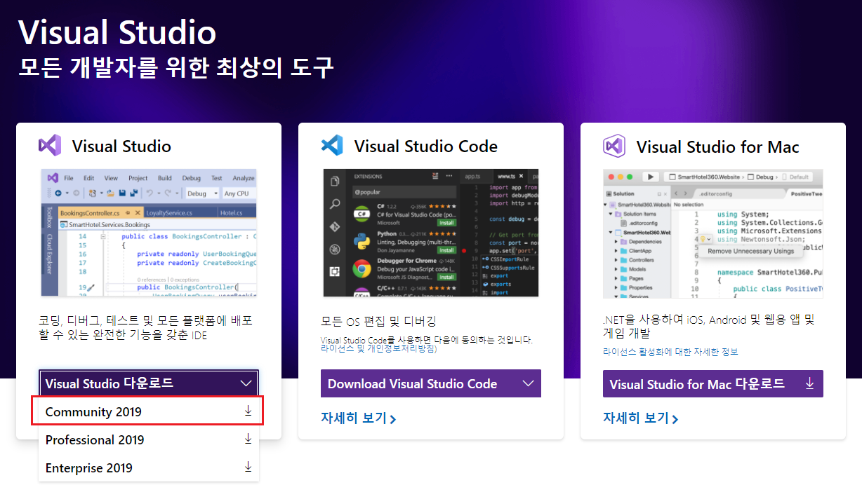 1) https://visualstudio.microsoft.com/ 에 접속
