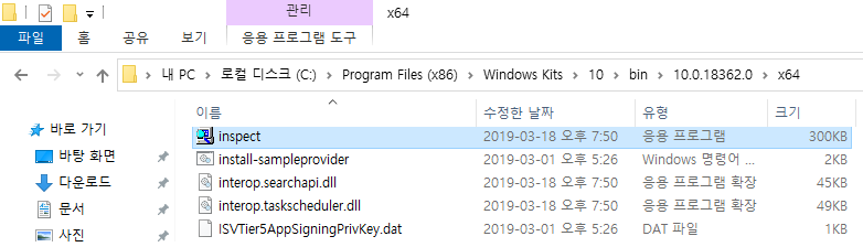 3) "C:\Program Files (x86)\Windows Kits\10\bin\10.0.18362.0\x64" 내 inspect.exe 실행