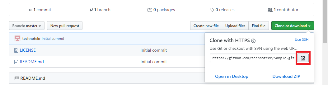 D:\Github>git clone https://github.com/technotekr/Sample.git