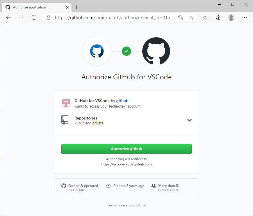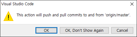 6) 첫 push 시 vscode에서 반영하고자 하는 github repository 에 push 권한 여부 확인이 필요하여 아래와 같은 절차가 진행됨