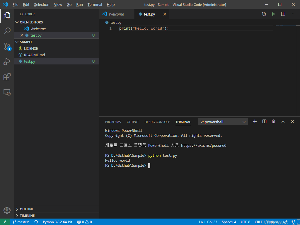 2) [Ctrl + Shit + `] 을 눌러서 teminal 을 실행시킨 후 수정 코드 실행해서 에러 유무 확인