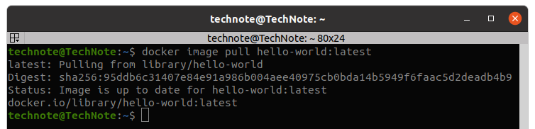 | technote@TechNote:~$ docker image pull hello-world:latest latest: Pulling from library/hello-world Digest: sha256:95ddb6c31407e84e91a986b004aee40975cb0bda14b5949f6faac5d2deadb4b9 Status: Image is up to date for hello-world:latest docker.io/library/hello-world:latest |