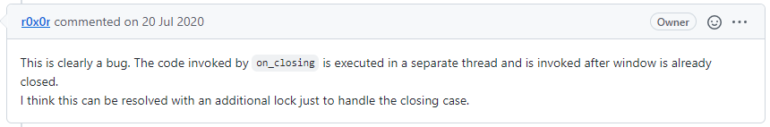 on_closing 은 별도의 thread로 처리되기에 해당 thread 에서 webview window 를 제대로 제어하지 못한다는 것으로 이해하였다.