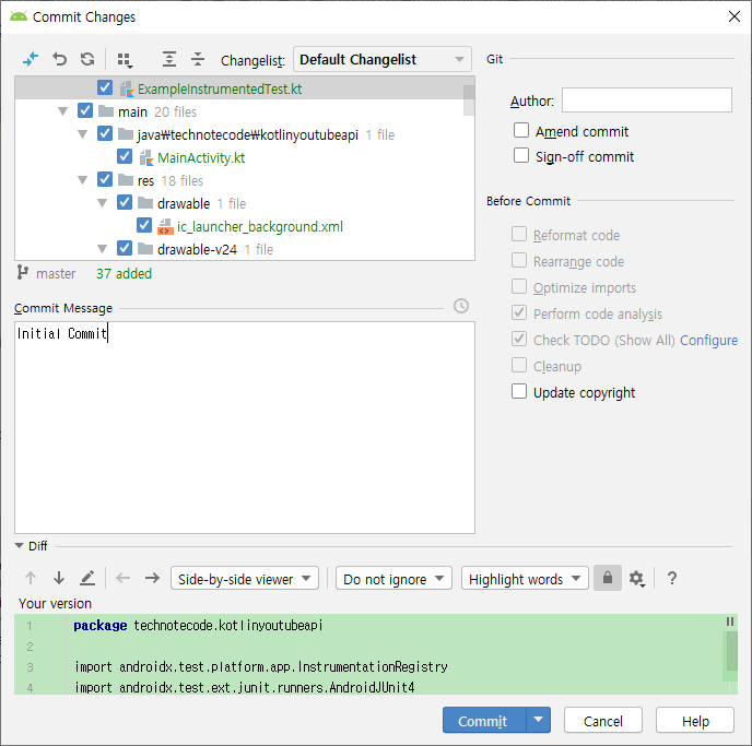 Initial Commit 을 할 파일들을 선택하는데 앞서 생성한 .gitignore 에 표시된 패턴의 파일/폴더들은 제외된다.